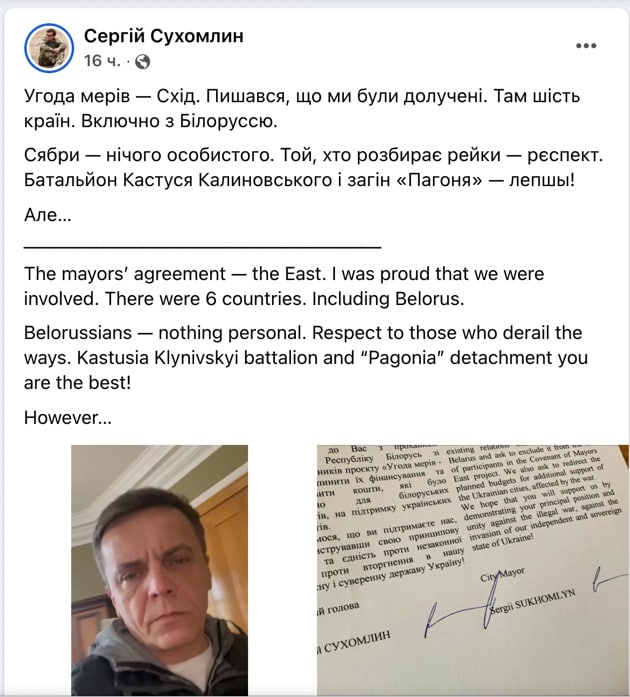 Сергей Сухомлин особенно подчеркнул тот факт, что беларусскими городами управляют не «мэры», а вертикальные назначенцы, чьи голоса не были слышны в Украине на протяжении всех дней войны.