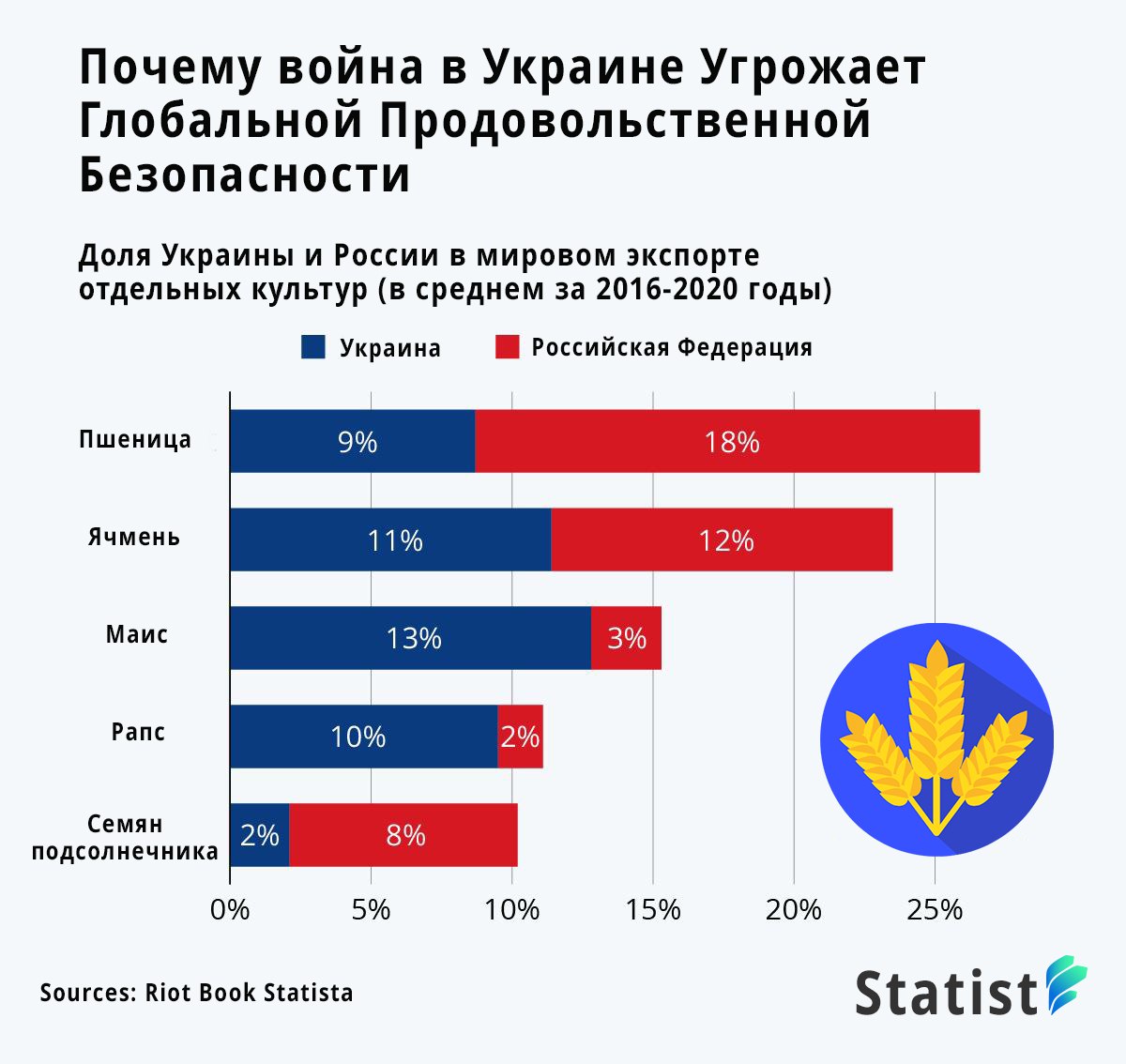 В России и Украине выращиваются около трети всей продаваемой на мировом рынке пшеницы, пятая часть кукурузы и производится три четверти подсолнечного масла. По прогнозам экспертов, война может привести к крайней нехватке продовольствия в беднейших странах.