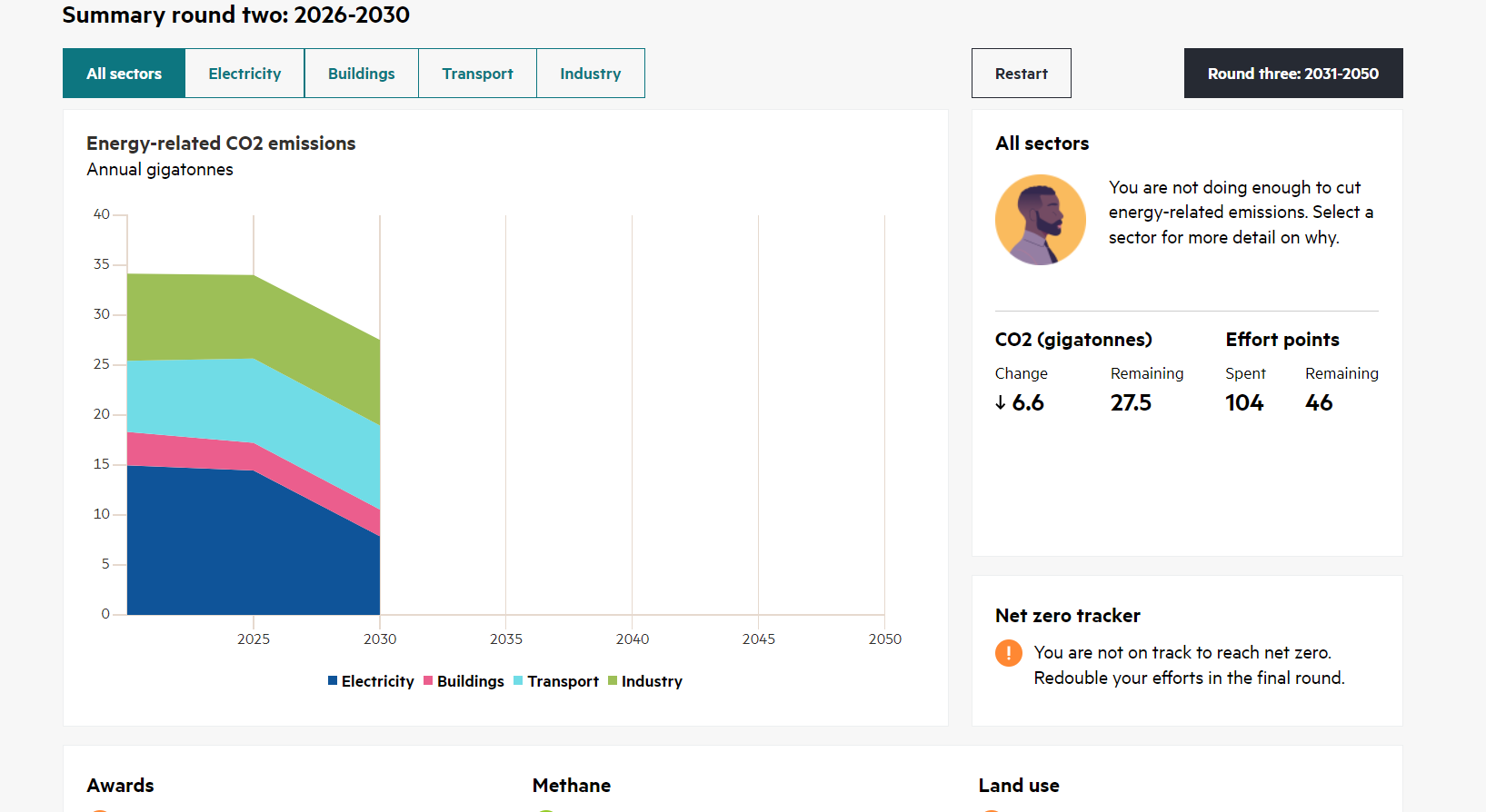 Всего в игре The Climate game три раунда, в течение которых мне нужно снизить выбросы парниковых газов до нулевой отметки к 2050 году и не допустить повышения температуры выше 1,5 градуса Цельсия.