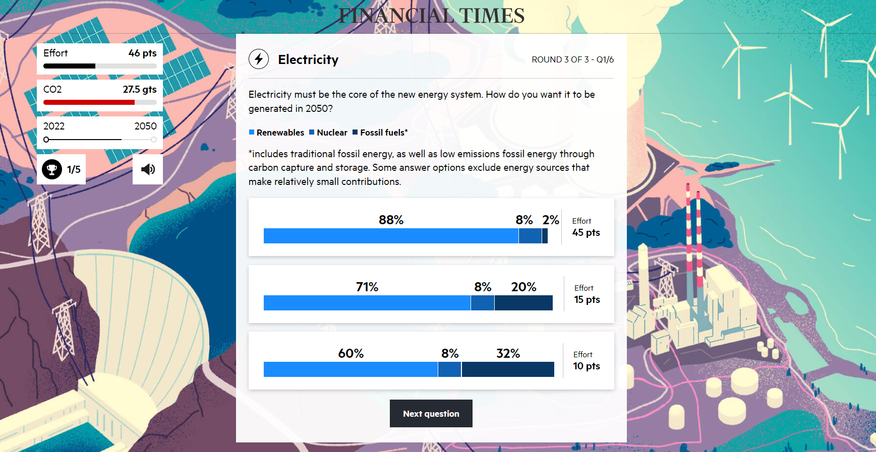 По мере продвижения в игре количество баллов будет снижаться, а принятие новых решений будет требовать все больше вложений. И если в первых раундах игры выбор, который вы делали, не способствовал значительному снижению уровня CO2, то по мере приближения к 2050 году решения будут стоить крайне дорого.