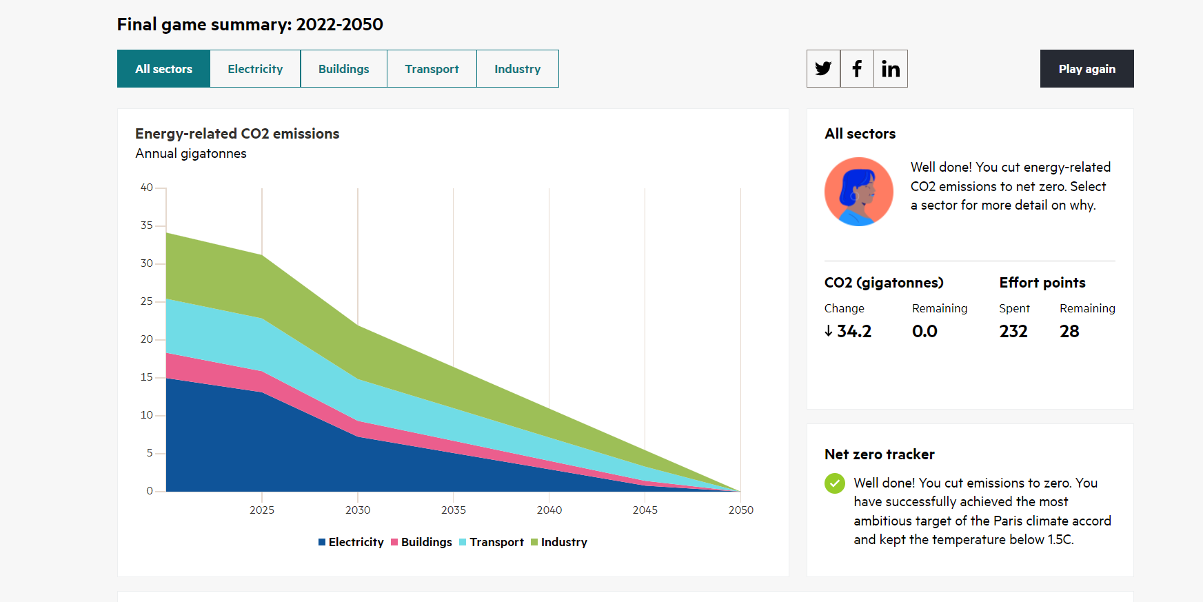 В конце игры игроки могут ознакомиться со своими результатами: узнать, насколько им удалось приблизиться к нулю и какие изменения произошли на планете за то время, пока они принимали ключевые решения.