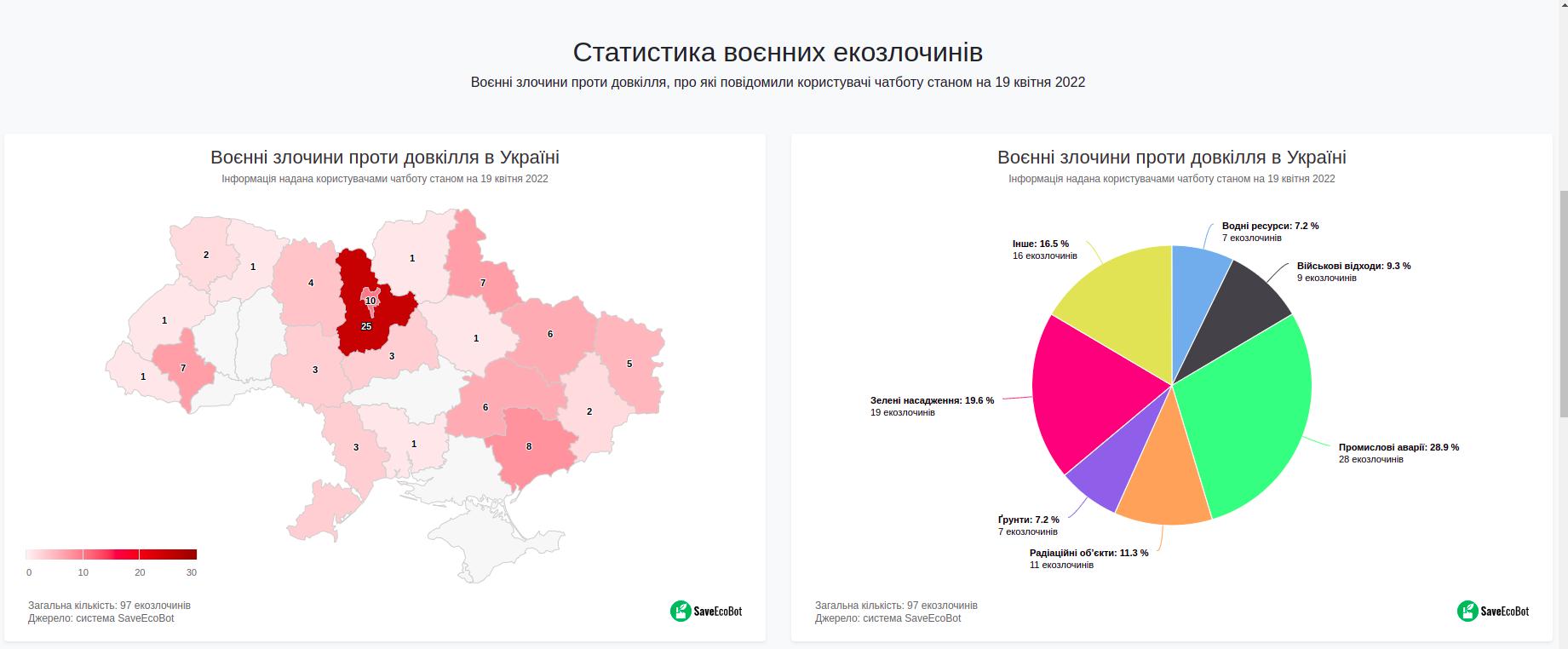 Оперативный штаб государственной экологической инспекции Украины совместно с SaveEcoBot зафиксировал уже 97 преступления против окружающей среды, вызванных военным вторжением.