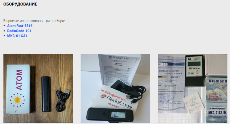 Последний использованный прибор, МКС-01 СА1, поверен и сертифицирован Росатомом. Он позволяет делать измерения не только гамма-, но и альфа- и бета- излучения, а также используется для поиска источников ионизирующего излучения, контроля радиоактивного загрязнения и оперативной оценки радиационной обстановки.