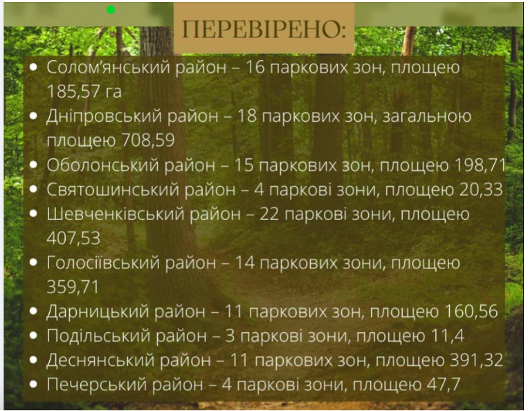 Специалисты провели проверку более 2.5 тысяч гектаров лесопарковых зон. Большинство парков и скверов были определены как безопасные для прогулок граждан. Однако все еще остаются закрытыми некоторые территории: часть парка Лысая гора, часть парка Киото, парк Борцов за свободу и независимость, парк Деснянский, парк Муромец, часть парка на острове Труханов, часть парка Пуща-Водица и часть Мариинского парка.