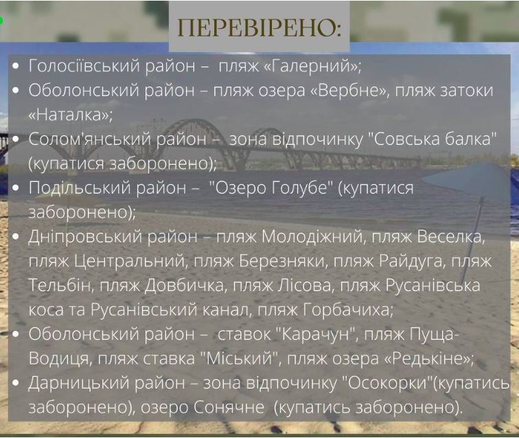 Также проверку на заминирование и наличие неразорвавшихся снарядов прошли пляжи и прибрежные зоны отдыха. На территории некоторых из них, например, в зонах отдыха Осокорки и Совская балка, а также на Озере Голубое все еще запрещено купаться. Это может быть связано как с последствиями войны, так и с санитарными требованиями.