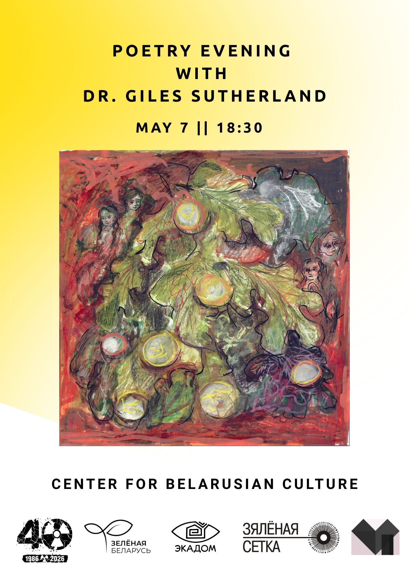 Запрашаем на творчую сустрэчу з шатландскім паэтам, мастацтвазнаўцам і эколагам доктарам Джайлсам Сазэрлэндам. Вечар будзе прысвечаны паэзіі як спосабу сведчання і асэнсавання экалагічных катастроф. Аўтар прадставіць свае творы, ў якіх прырода, памяць і чалавечая адказнасць пераплятаюцца ў адзінае цэлае.